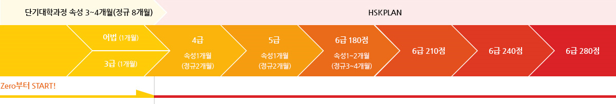 1~3개월 안에 HSK6급 180점에 도달. 이후 단계적(도약반 210점 / 고득점반 240점 / 만점만 280점)으로 고득점 도전