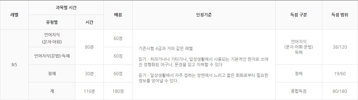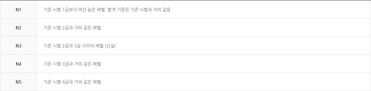 시험에서는 레벨을 현행 시험 4단계(1~4급)에서 5단계(N1~5)로 증설하였고, 新시험과 기존 시험과의 비교 레벨은 아래와 같습니다.