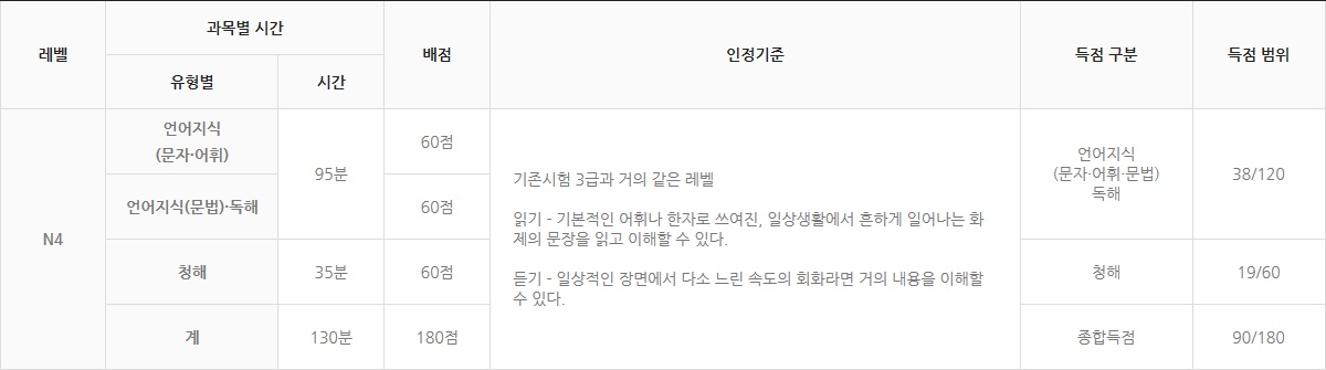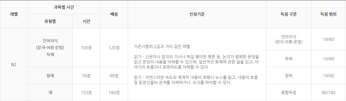 각 레벨에 따라 N1~N2는 언어지식(문자·어휘 ·문법)·독해, 청해의 두 섹션으로, N3~N5는 언어지식(문자 ·어휘), 언어지식(문법) ·독해, 청해의 세 섹션으로 나누어져 있습니다.