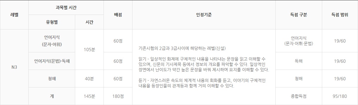 크게 변경된 사항은 기존 시험의 2급과 3급 사이에 N3라는 레벨을 신설한 것입니다.