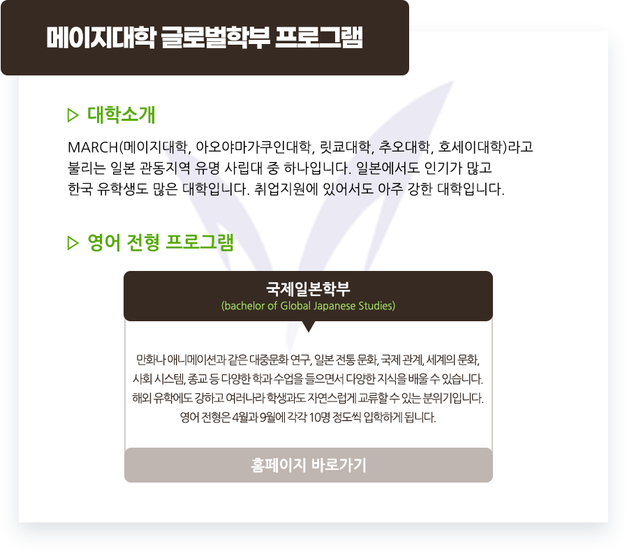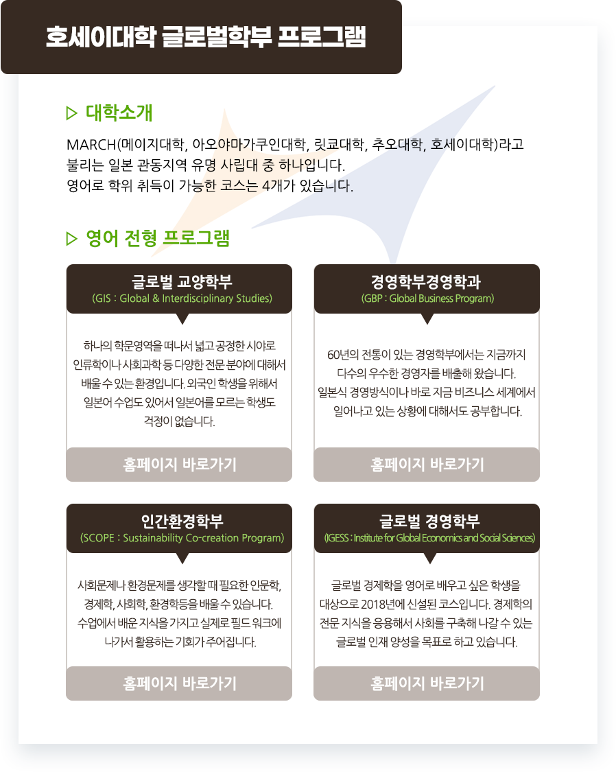 예를 들어 게이오대학(PEARL), 소피아대학, ICU, 릿교대학, 메이지대학은 SAT/ACT 성적이 필수이며, 구제국대(국립대)도 있으면 유리합니다.