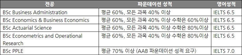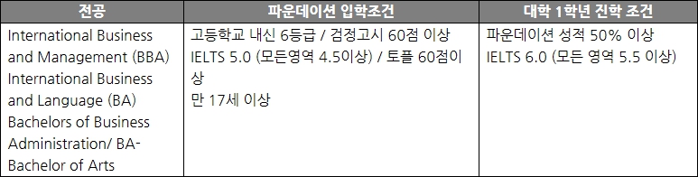 *International Business and Management(BBA)의 경우 FAST Track (3년과정) 을 제공합니다. 단 이 과정의 경우 진학이 개런티 되지 않으며 파운데이션 성적에 따라 일부 선발합니다.